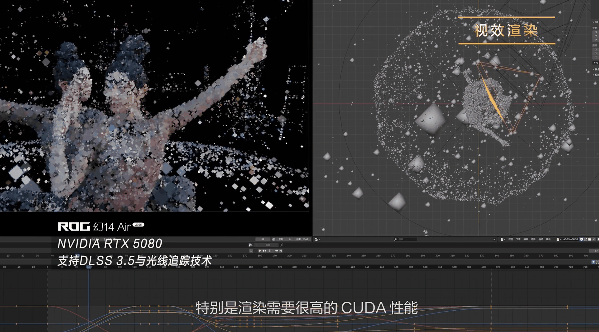 而幻14 Air凭借最高配置的RTX 5080显卡和AMD锐龙AI 9 HX 370处理器,在仅轻约1.57kg的机身中提供了强大的图形渲染能力,快速处理舞者的动作捕捉数据和石窟三维模型,并进行4D高斯的渲染合成。